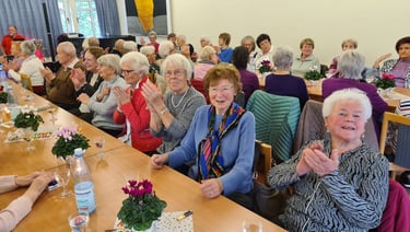 Im Pfarrheim ging die Post ab: kollektives Schunkeln, Singen, Tanzen, Klatschen. Das Ganze war zugleich symbolische Geburtstagsfeier für alle Alfterer Seniorinnen und Senioren, und so bekam Jede/r ein kleines Geburtstagsgeschenk – das traditionelle Alpenveilchen.