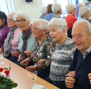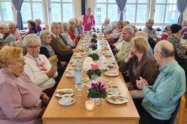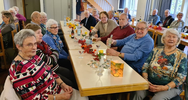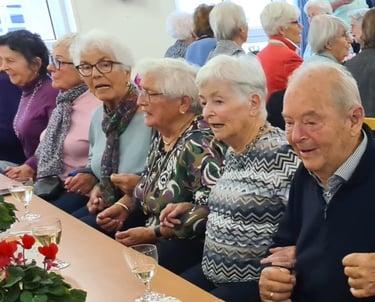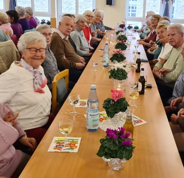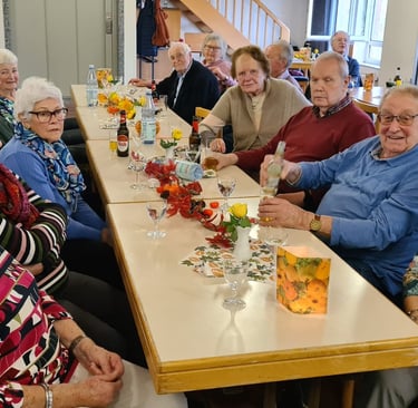 Einmal im Jahr feiern wir symbolisch den Geburtstag unserer Seniorinnen und Senioren - bei Zwiebelkuchen, Weißwein (Federweißen gab’s nicht mehr) und steigender Stimmung. Ob es zwischen Wein und wachsender Partylaune einen Zusammenhang gibt, wissen wir nicht. Wollen wir auch nicht wissen.