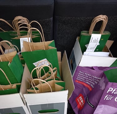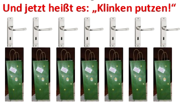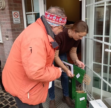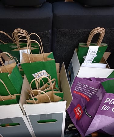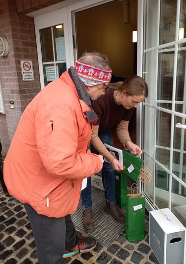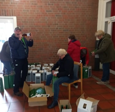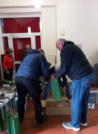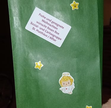 Sehr geschmackvolle Geschenktüten dafür hat die Genussschule Alfter beigesteuert – in unermüdlicher Heimarbeit unseres ältesten Helferleins Carola Stapmanns (96) noch mit Weihnachtssternchen verziert. Am 24. November fanden Tüten und Flaschen im Foyer des Pfarrheims zueinander, wurden in unsere Autos verladen und werden nun zu rund 40 „Endverteilern“ gebracht.