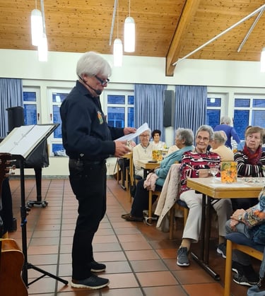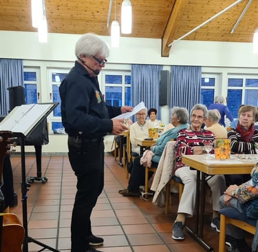 Nach diesen wundervollen Eindrücken vom Leben in unseren Feldern, Wiesen und Wäldern hielt am 26.März 2025 „dä Vezäll“ Einzug ins Pfarrheim. Anke Fengler und Udo Navratil lasen zum Beispiel aus dem Struwwelpeter vor oder sorgten mit Anekdoten von Heinz Erhard für Gelächter. Das Ganze war garniert mit musikalischer Begleitung zum Mitsingen. Herzlichen Dank für einen schönen Nachmittag!