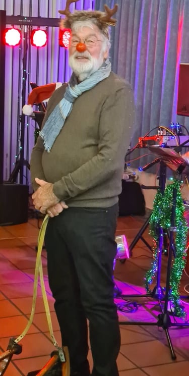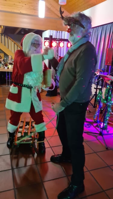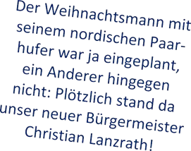 Auf diese Weise durften wir einen außerordentlich sympathischen Zeitgenossen persönlich kennenlernen. Herzlichen Dank für den spontanen Besuch! Mittlerweile war es draußen dunkel geworden, und nun erst kam der Sternenhimmel so richtig zur Geltung, den Engelbert Diederichs an Decke und Wände projiziert hatte. Jetzt war es wirklich weihnachtlich! Und mitten in diese andächtige Stimmung platzte Herbert Lotz, der Dieter Ried hinter sich her zerrte – oder weihnachtlicher ausgedrückt: Und mitten in dieser andächtigen Stimmung erschien uns der Weihnachtsmann in persona Dieter Ried, von drauß vom Walde her kommend, festlich gewandet und auf einem Davos-Kinderschlitten sitzend, welcher gezogen wurde von einem schmackhaften Nutztier namens Rudolf, gedoubelt vom Sangesbruder des Weihnachtsmannes, dem „Lotze Herbert“.