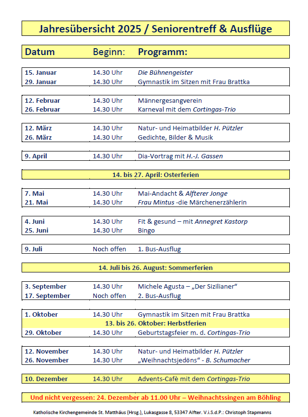 Alle Seniorinnen und Senioren (ab 65 Jahre) sind in unserem Kreise herzlich willkommen.